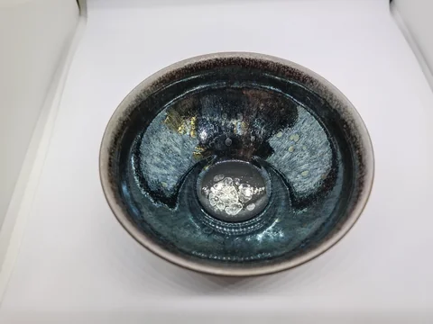 - 釉色特徵:此盞罕見地使用了柴燒曜變技術,表面有黑核斑的特色,盞內則呈現黑核銀斑。在柔光燈照射下,盞內的斑帶呈現出彩色光影。